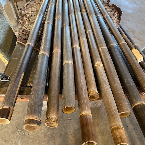 Een mobile van donkere bamboe is het geworden. Zeven stokken van 3.50 mtr. lang, 8-10 cm. dik, hooglans gespoten met matzwarte uiteinden. Geheel afgestemd op het TAU-concept.