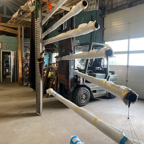 De totale hoogte van de mobile is 3.90 mtr. geworden. Halsbrekende toeren hebben we uit moeten halen om deze mobile uit te balanceren. Mijn atelierruimte is eigenlijk te krap om zoiets te contstrueren, maar met behulp van een oude heftruck, ladders en trappen, beschermdekens en een hoop beschermed bubbeltjesfolie hebben we het tot een goed einde weten te brengen. Ik zeg we omdat dit project zeker niet gelukt zou zijn zonder de hulp van een goede vriend.