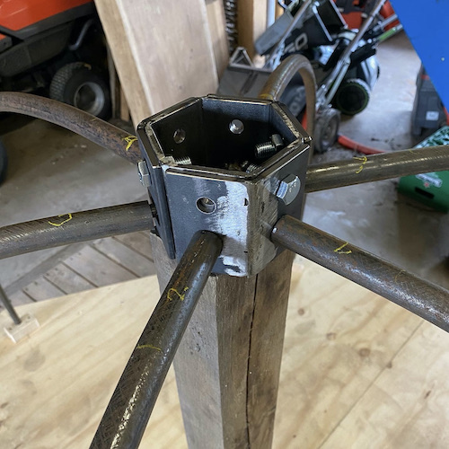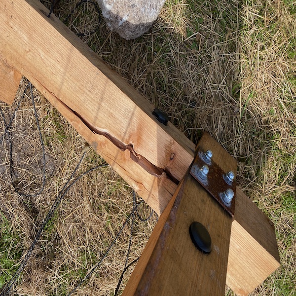Helaas heeft mijn folly het niet langer dan twee weken uitgehouden. De krachten op de half-hout hoekverbinding in combinatie met krachtige windstoten bleken te groot voor mijn ontwerp. Wat resulteerde in breuk en instorten.